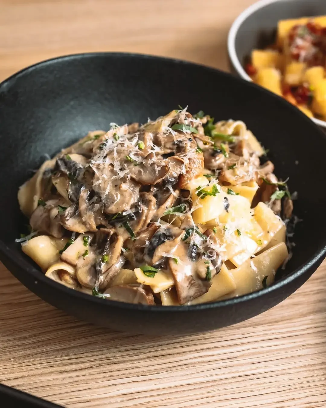 Ribbon pasta with mixed mushrooms in creamy taleggio sauce.