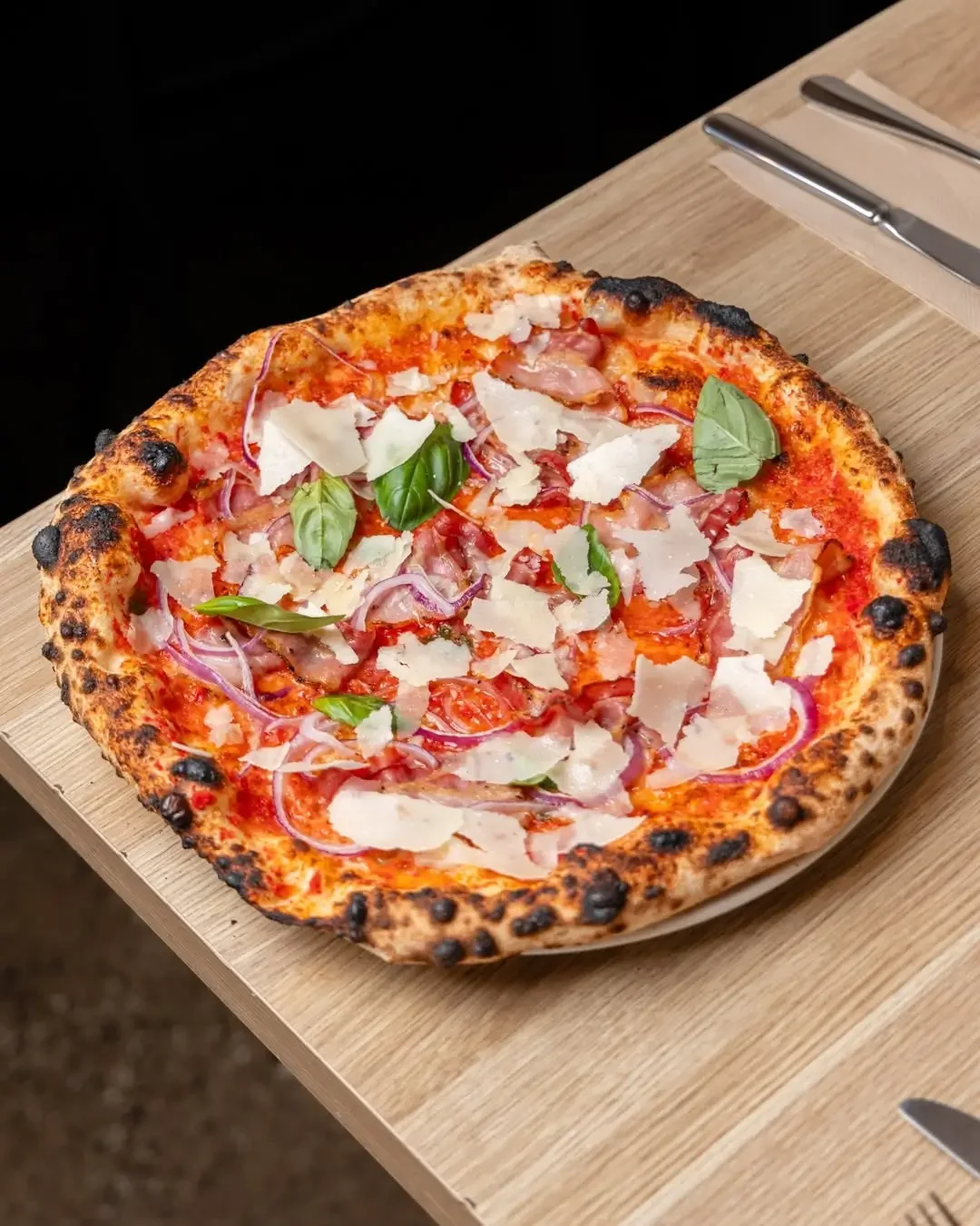 Wood-fired pizza with pancetta, red onion, garlic, and shaved parmesan.